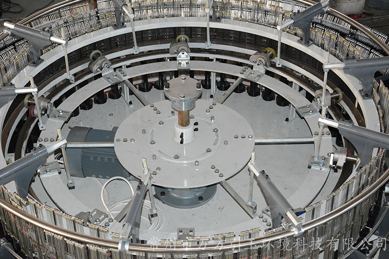 圓織機的經紗架上有有許多紗錠,依據編織布幅寬和扁絲寬度,使用規定范圍數量的經紗.經紗進入圓織機前,由經紗的棕框對經紗進行交叉開口,緯紗梭子在交叉開口中作圓周運動穿過經紗,編織成筒布. 一臺圓織機有幾把梭子,就有幾條緯紗同時織入.對于平織布,可用平織機,片梭織機,噴水織機編織.